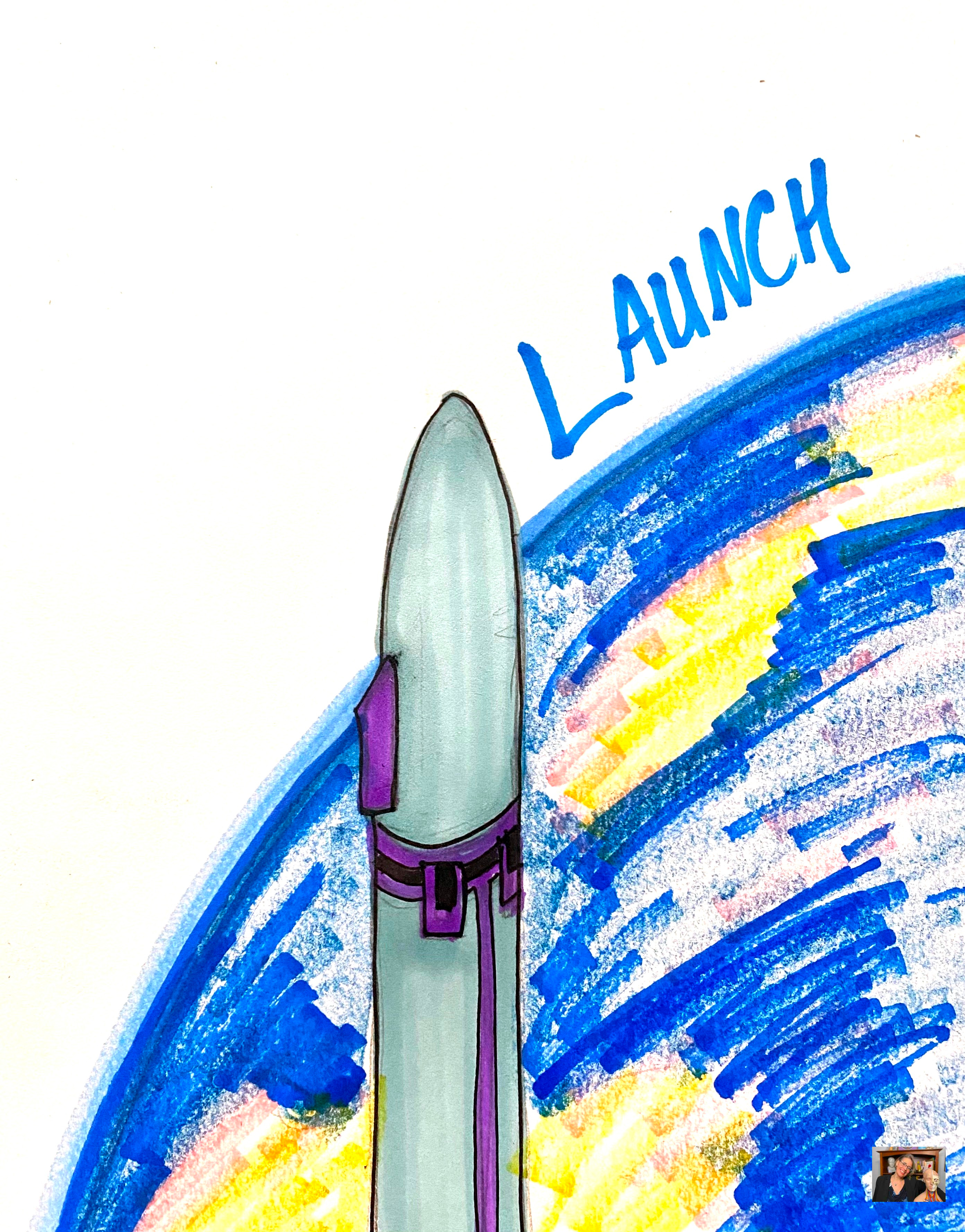 A jade green rocket—symbolizing well-being, longevity, emotional healing, and self-love—ascends into space at the throat chakra level, the glowing earth beneath it. Its fins and stripes shine in imperial violet, a color of manifestation, signaling the lift-off of what we’ve been working to bring forward.